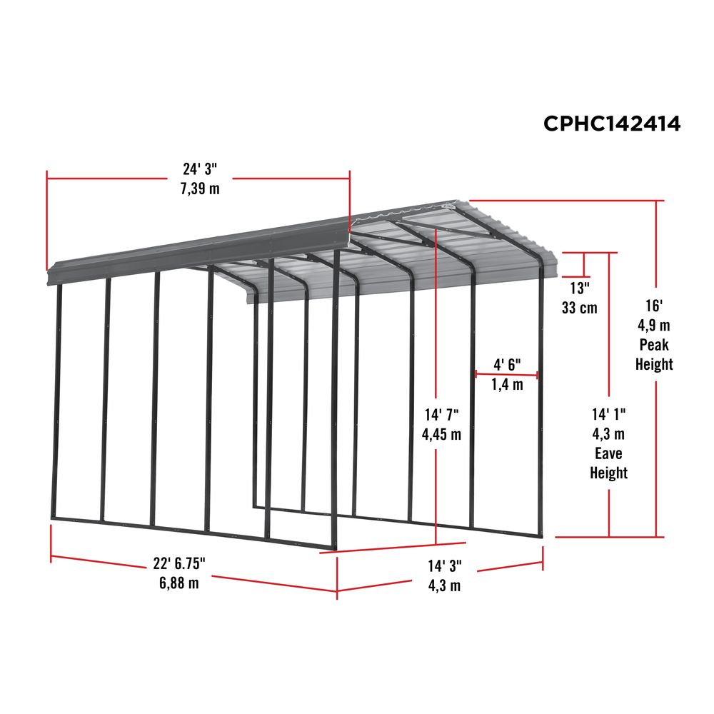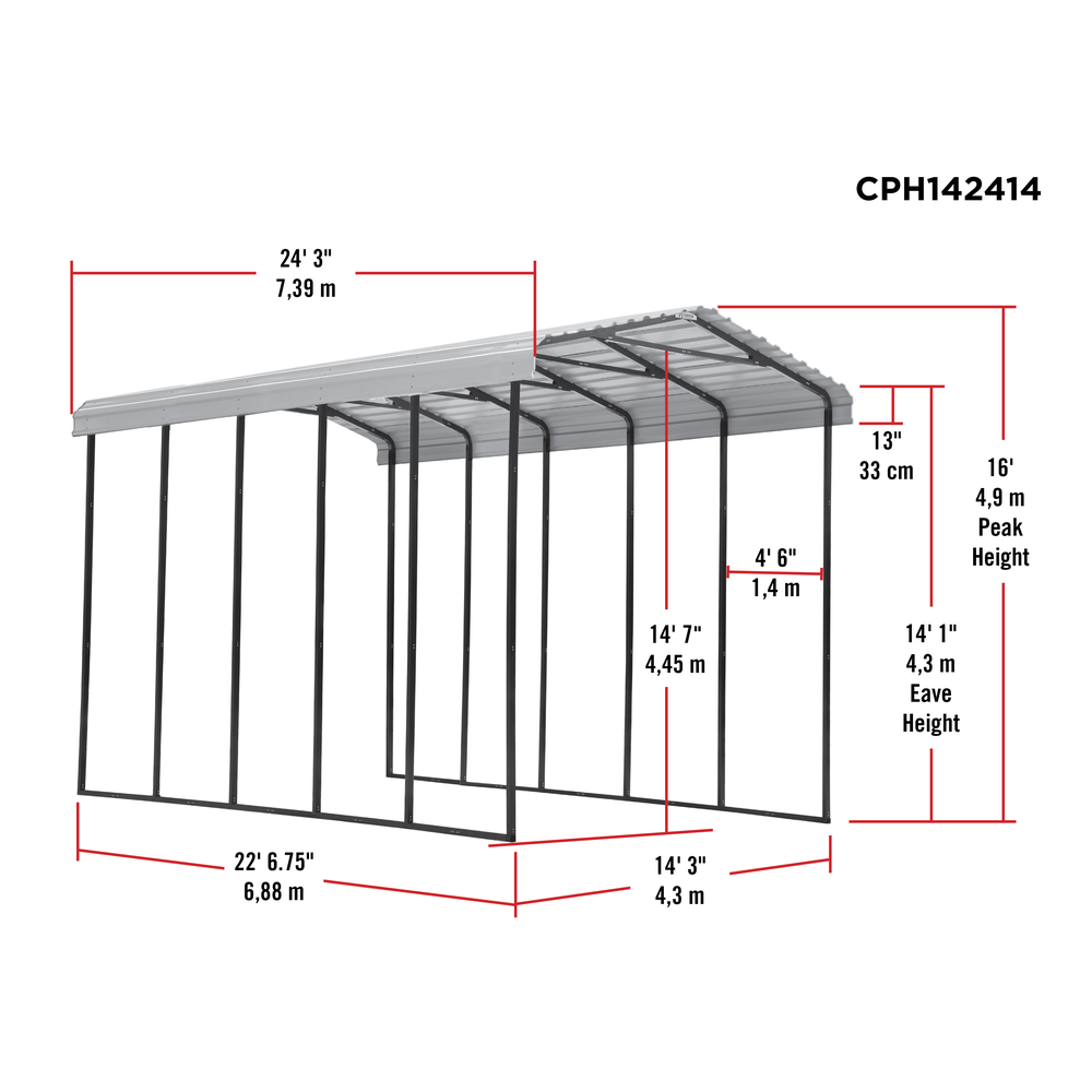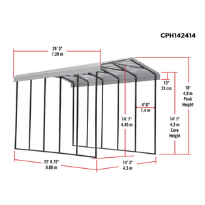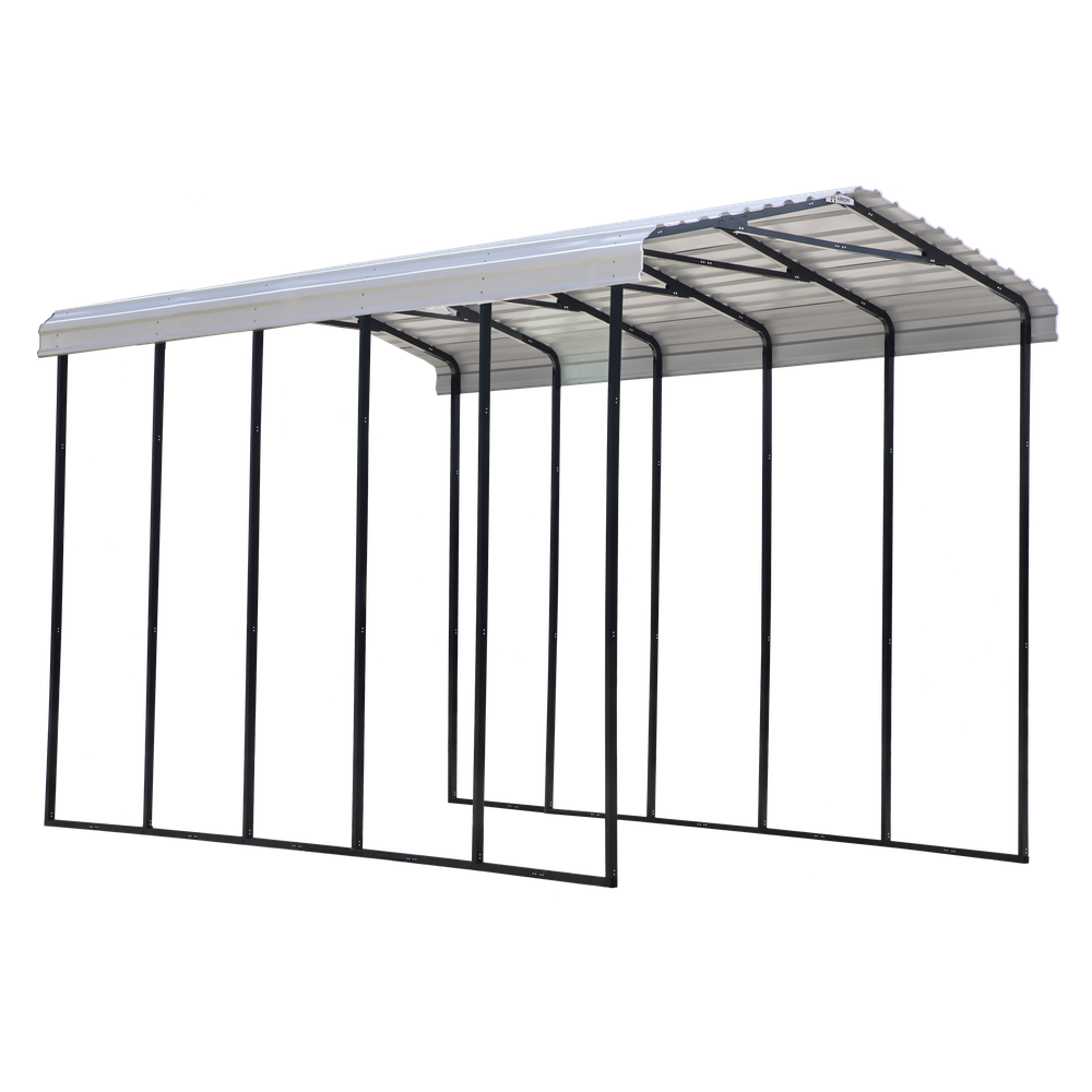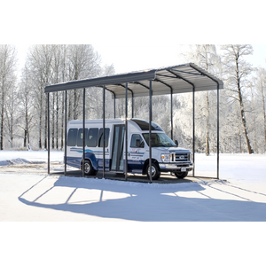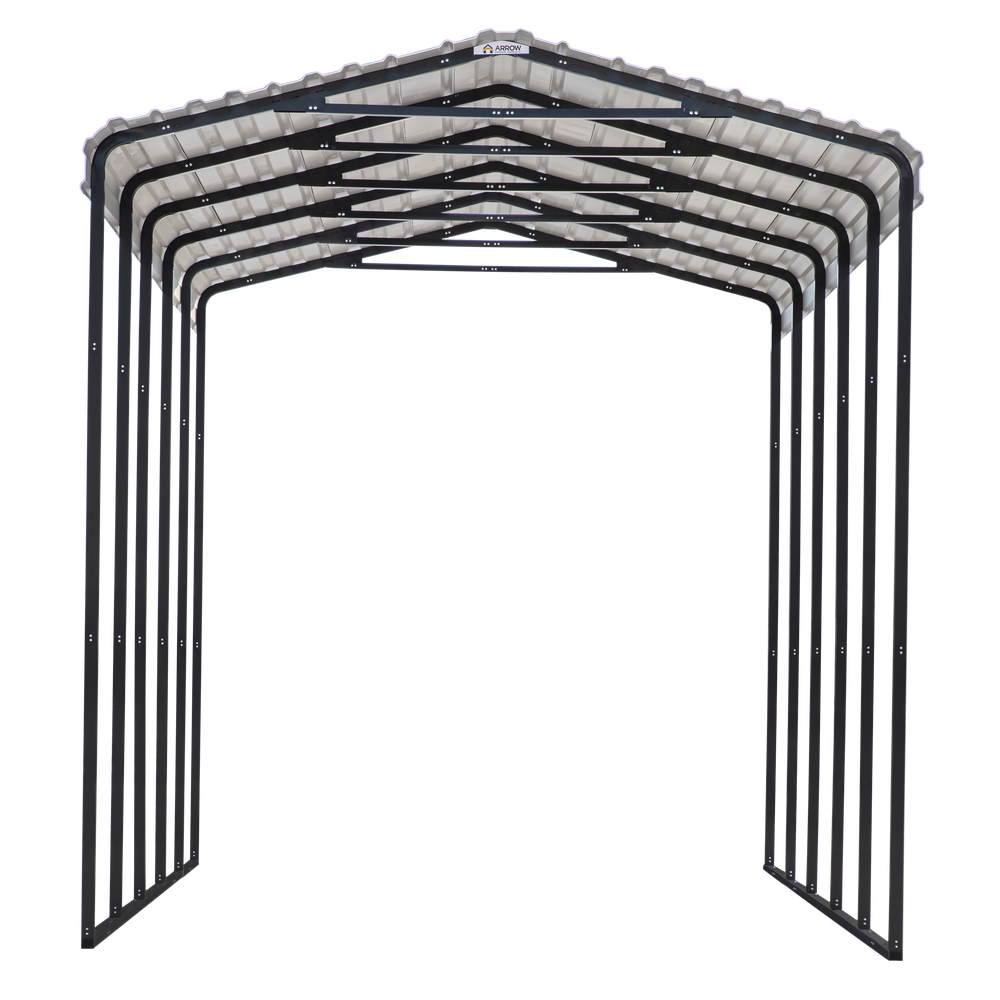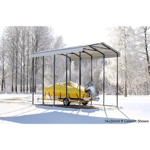 The all-steel RV Carport from Arrow is a convenient, all-weather shade and shelter solution that's versatile and practical. The Arrow Steel RV Carport with Metal Cover is equipped to protect a variety of vehicles including your RV, Motorhome, Camper, Truck, Tractor or 5th Wheel camper. Each Arrow RV Carport is made strong with a wind and snow load rating, meaning they are designed to take on tough weather and snow storms. The 14 foot high Metal cover is made from galvanized steel to offer your vehicle years of protection from the weather and harmful UV rays. The steel frame is durable and is made with a powder coating finish to protect the carport for extended corrosion protection. Easy to install, the Carport comes with slip-fit connections with pilot holes and self-taping screws making this unit easy to build straight out of the box.
