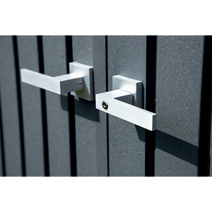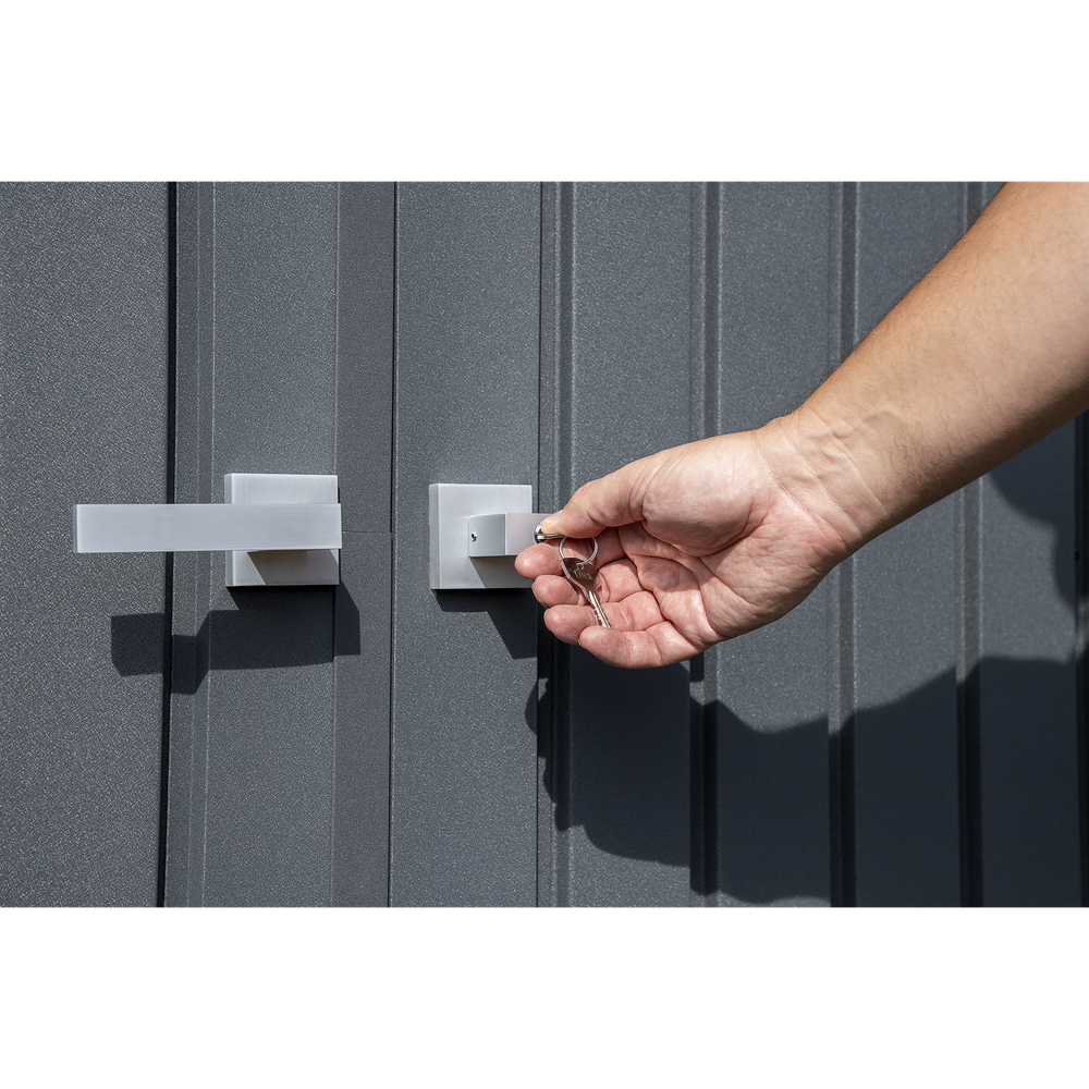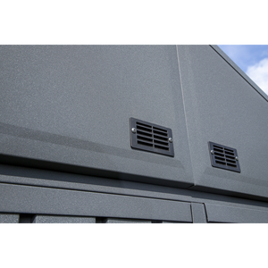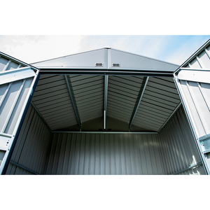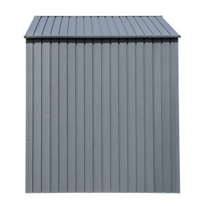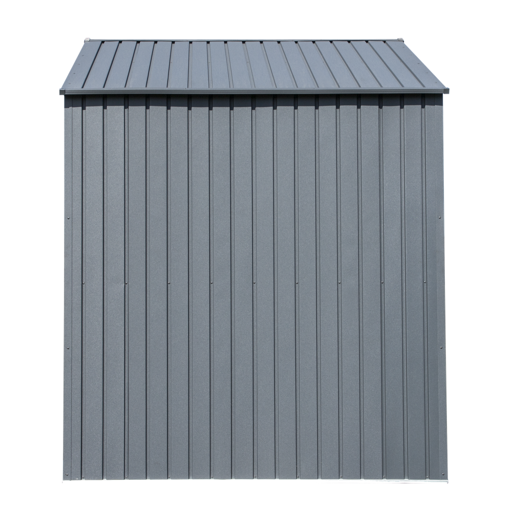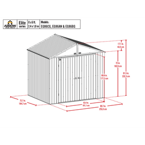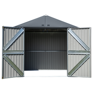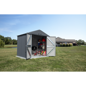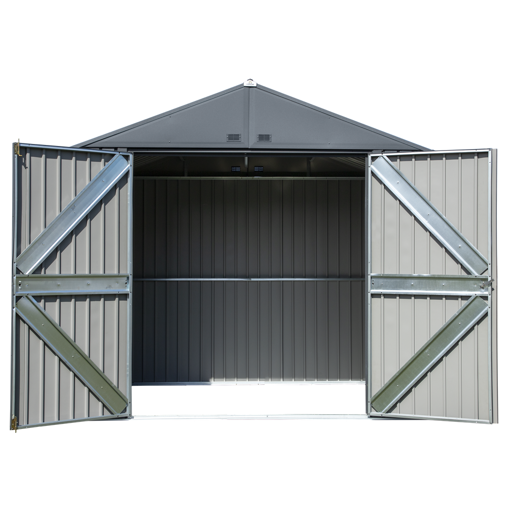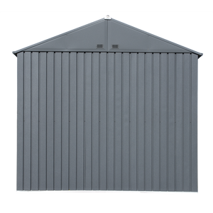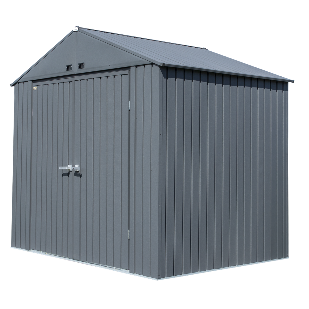 Arrows’ Elite series 8 ft. x 6 ft. steel shed is an innovative premium storage solution with revolutionary new features. The Arrow Elite series storage shed has an attractive squared wall design and textured wrinkle paint in an anthracite finish, making it a welcome fixture in any backyard, garden or outdoor setting. Made from Galvalume, a US steel with an aluminum and zinc plating which is highly anti-corrosive, this steel shed is built to last! The Elite series sheds also feature a tall 72 in. wall height and high gable roof for added headroom, plus extra walk around space. The rigid reinforced swing open doors with brushed nickel key lock handle allows for easy access to the interior, while allowing storage against the front wall. In addition, gable vents provide increased air flow to the shed’s interior. All hardware is included for assembly.