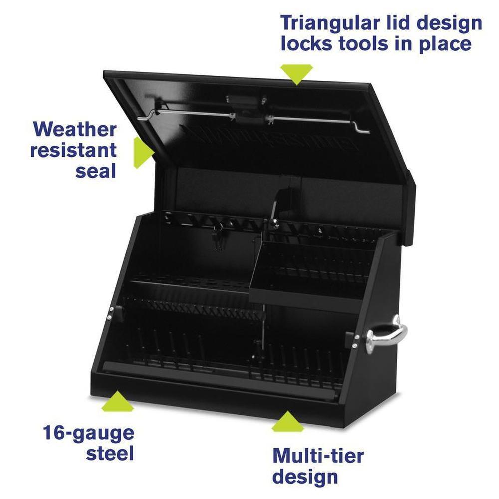 This Montezuma Triangle Tool Box with Free Shipping is the ideal tool storage solution for any garage, helping you get more done in less time whether in the home or work setting. Designed on the farms of Kansas to be rugged and hard-wearing, you'll notice the design expertise that gives you quick access to your most important tools and the rugged build quality and locking that give you total confidence that your tools are safe and sound.