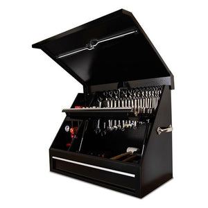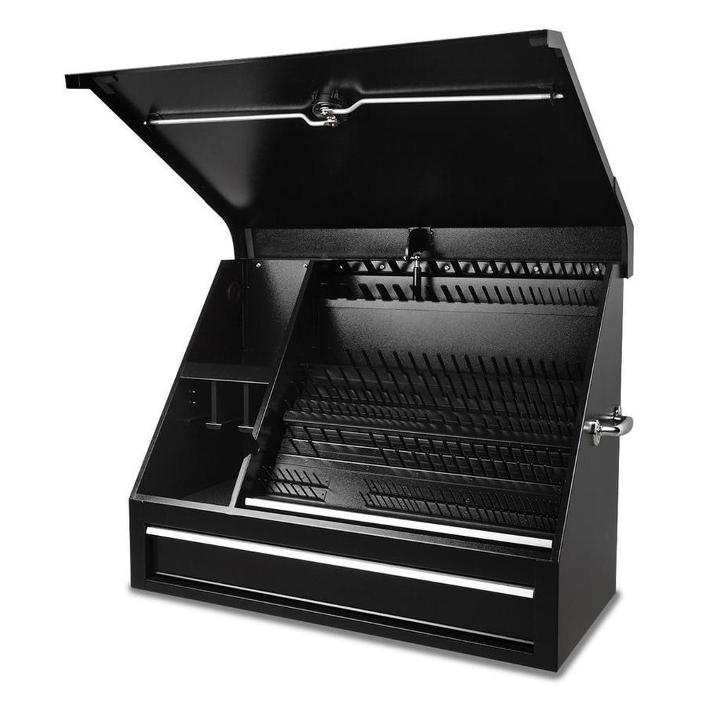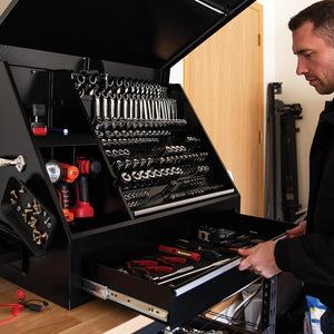 You Receive: 1x Montezuma 36" x 17" Steel Triangle Shop Box with Drawer in Black