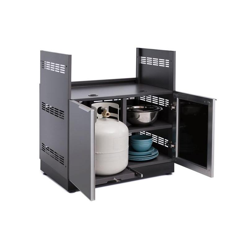 This stylish Gas Grill Cabinet from NewAge is the perfect centrepiece for your outdoor kitchen. Drop in a compatible 28 in. to 33 in. gas grill and enjoy the smart design such as a pull-out, locking propane tank tray and ample shelf space for storing cook tools, spices and gloves. The solid construction gives plenty of support for heavy-duty grills while the soft-close door hinges give easy access to propane and supplies. Multiple gas line access ports are pre-punched for ease of setup, and the height-adjustable levelers ensure your cabinet and grill is perfectly level. NewAge Products does not guarantee the compatibility of third party insert grills. Check your grill product manual for compatibility and safety requirements.