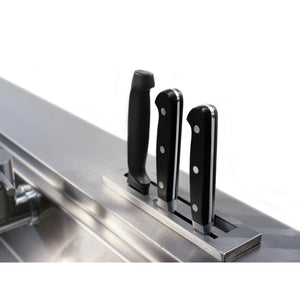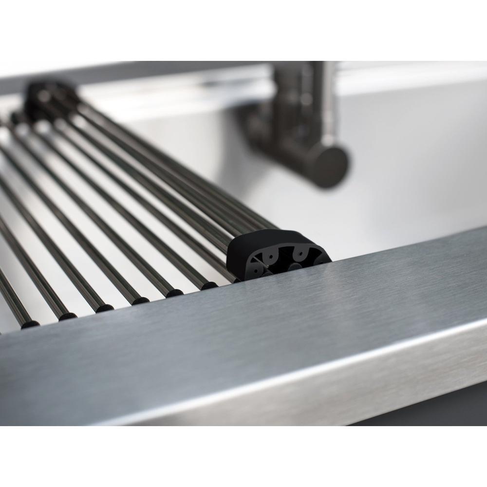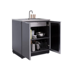The Outdoor Kitchen Sink Cabinet provides a convenient clean-up station for muddy hands and dirty dishes. Food prep and after-party cleanup are a breeze with the full width 7 in. deep stainless steel sink basin and fold-down faucet. The 304 Stainless Steel construction ensures the cabinet is solidly built, with one fixed shelf and plenty of room for clean-up supplies, waste bags, and organic bins. The Sink Cabinet is designed with entertaining in mind, with additions like an extra deep sink basin, integrated knife holder with PVC well, and a roll-up dish drying rack, your dishes will always stay clean. Installation is made easy with pre-punched plumbing ports and braided steel intake hoses for a quick connection to your water supply, while the height-adjustable levelers keep the cabinet level on all surfaces. Convenience and cleanliness, right in your backyard, with the NewAge Products Outdoor Kitchen Sink Cabinet. Keep organized and upgrade your backyard living space, with NewAge Products Outdoor Kitchen cabinets in Slate Gray.