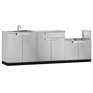 Get grilling, and maximize your backyard storage space, with Outdoor Kitchen cabinets. Constructed from restaurant-grade, 304 stainless steel, with reinforced double-wall doors, these cabinets are weather and corrosion resistant, for all-season durability. The Sink Cabinet provides a convenient clean-up station for muddy hands and dirty dishes, with a 7 in. deep stainless steel sink basin, allowing you to spend less time in the kitchen, and more time with your guests. The Bar Cabinet has a height-adjustable wine rack, full-extension beverage chilling drawer and trash drop-in bins. The 40 in. Insert Grill has 75,000 total BTUs and offers 793 square inches of cooking space, with premium features that allow you to cook with both power and finesse. The Insert Grill cabinet accepts grills with widths between 34 13/16" and 38 3/8" The NewAge Products Outdoor Kitchen cabinets in Stainless Steel or Grove provide a clean, professional look that will get your backyard organized.