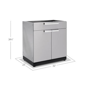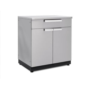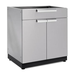 The NewAge Products Outdoor Kitchen 2-Door with Drawer Cabinet lets you organize grilling tools, entertaining supplies, and other outdoor items for a tidy backyard living area. A full-extension drawer provides quick access to cutlery, sunscreen and other necessities, while the multi-function storage space with height-adjustable shelf allows you to store large and heavy items like dishes or backyard games. With a total weight capacity of 350 lbs. the stainless steel frame not only looks great, but easily supports a spanning countertop for added prep space. The Outdoor Kitchen 2-Door with Drawer Cabinet in Stainless Steel or Grove is a versatile storage unit to complete your ideal Outdoor Kitchen.