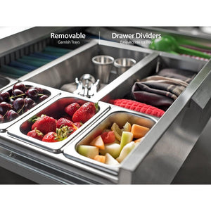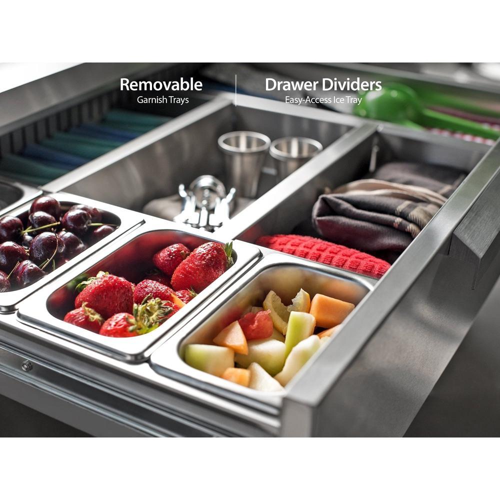 The top drawer comes equipped with a removable ice tray and four stainless steel garnish trays