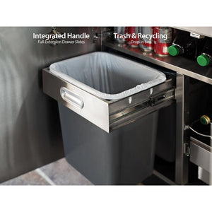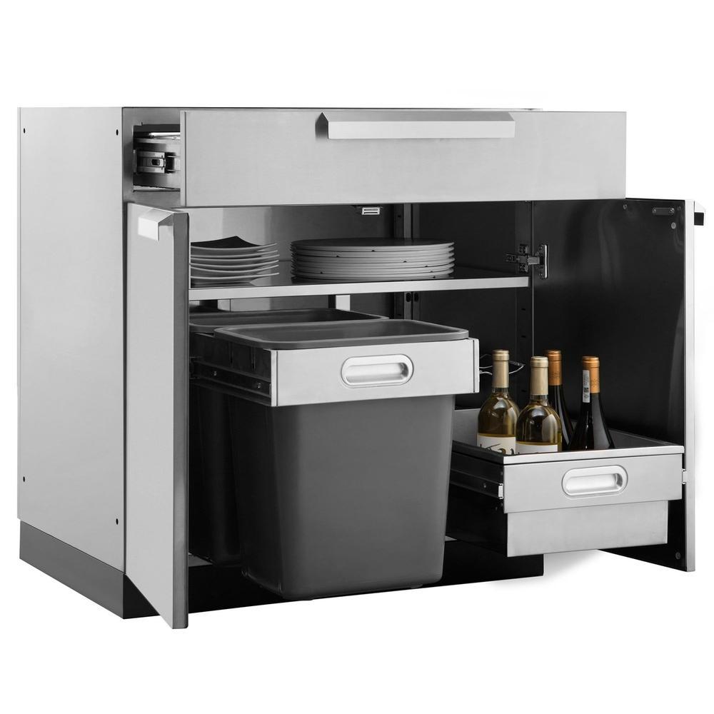 The Outdoor Kitchen Bar Cabinet is a must-have storage unit for the host who is ready to celebrate any occasion. The top drawer opens on soft-close drawer slides, to reveal an ice tray for refreshing guests’ drinks, four garnish trays for constructing cocktails, and stainless steel dividers to easily organize drink accessories and corkscrews. Inside the cabinet are drop-in bins for waste and recycling, an adjustable wine rack, and a pull-out beverage chilling drawer which can be easily removed for restocking with ice and drinks. The fixed shelf is a perfect space for storing soda, garbage bags, and bar towels, and the double-wall doors include a convenient door mounted bottle opener. Fully assembled, and built from 304 stainless steel, the NewAge Products Bar Cabinet will keep you organized and help you get the party started.