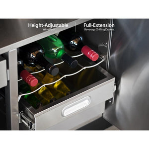 Height-adjustable wine rack and full-extension beverage chilling drawer