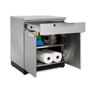 Get grilling, and maximize your backyard storage space, with Outdoor Kitchen cabinets. Constructed from restaurant-grade, 304 stainless steel, with reinforced double-wall doors, these cabinets are weather and corrosion resistant, for all-season durability. Adjustable shelves let you customize your 2-Door Cabinet to store any sized items. The 3-Drawer Cabinet has adjustable upper drawer dividers for cutlery and tool organization, with two extra deep drawers, perfect for storing all your hosting essentials. The 2-Door with Drawer Cabinet lets you organize grilling tools, entertaining supplies, and other outdoor items for a tidy backyard living area. The Prep Table has the strength to handle heavy dishes and messy tasks, while remaining light enough to move to where you need it. The NewAge Products Outdoor Kitchen cabinets in Stainless Steel or Grove provide a clean, professional look that will get your backyard organized.