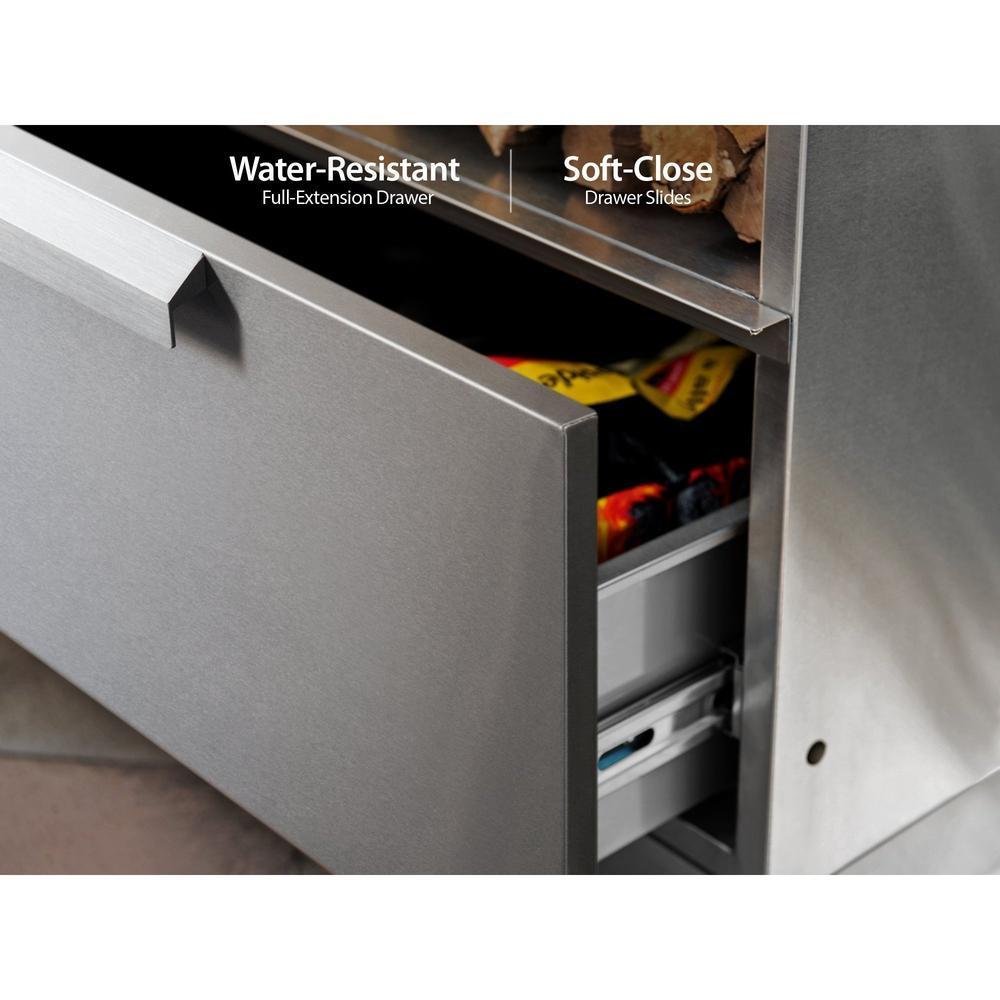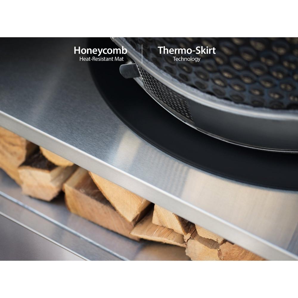 The Outdoor Kitchen Kamado Cabinet easily supports most ceramic BBQs, with plenty of additional storage space and unique features to elevate your culinary techniques. This cabinet can accommodate multiple sizes of ceramic Kamado BBQs and has a honeycomb, heat-resistant silicone mat to disperse the heat evenly, keeping the shelf cool, even at extreme temperatures. This cabinet is for use with compatible ceramic Kamado Grills only. Check your Kamado product manual for compatibility and safety requirements. This cabinet is built for all-season durability with its restaurant-grade, 304 stainless steel frame and UV resistant louver-style doors in a wood-grain finish. The extra-deep weather-resistant drawer is a great space for storing wood chips, charcoal and serving platters under your Kamado. Soft-close drawer slides allow it to close gently, reducing slams while you’re barbecuing. Upgrade your barbecuing experience with the NewAge Products Outdoor Kitchen Kamado Cabinet.