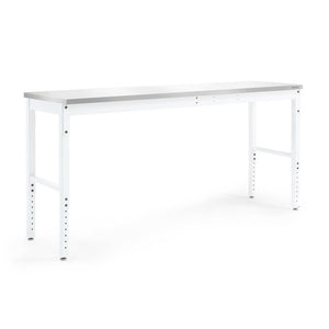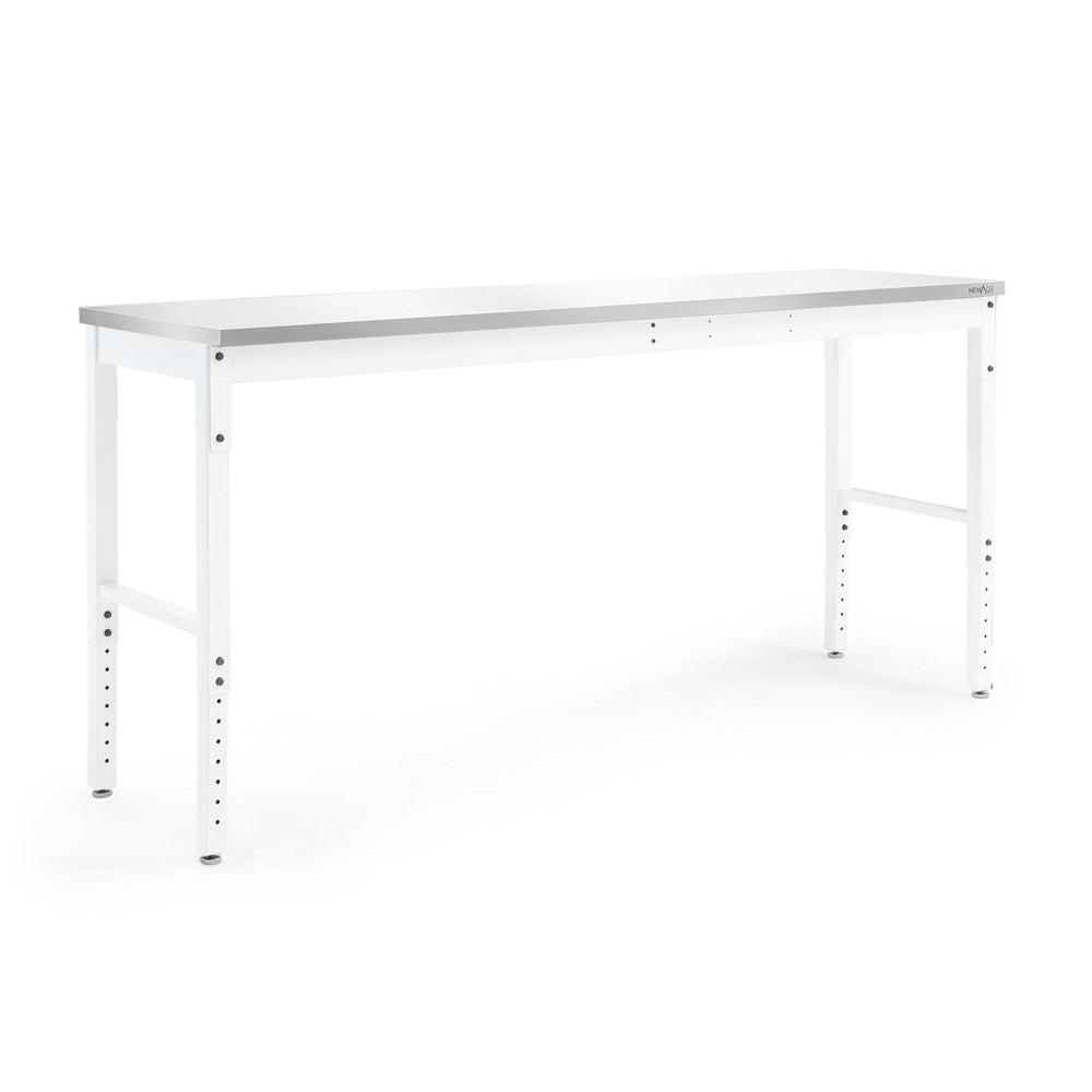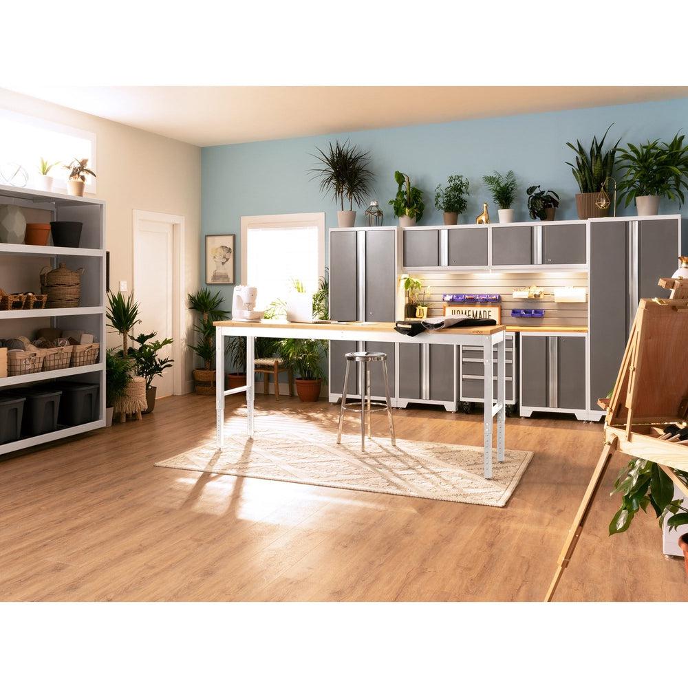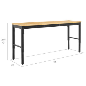 Create the perfect project workstation for your garage with the Pro Series 84"" Adjustable Height Workbench. The steel Workbench is built tough, to handle any project. The Workbench has an impressive weight capacity of 2,000 lbs.; giving you a rock-solid surface to support your tools, building materials, and everything you need to get the job done right. Every project is unique, and you need a workspace that can adjust to meet your needs. The height-adjustable legs allow you to set the optimal frame height for comfortable work sessions, with adjustable leveling legs that provide a perfectly level work surface on uneven garage floors. Set up your NewAge Products Workbench against the wall for a perimeter work area, or seamlessly integrated into your Pro or Bold Series cabinet set with its color-matched frames. For projects that require 360-degree access, the Workbench can be easily maneuvered to your desired work area. Built tough for any project, the Pro Series 84" Adjustable Height Workbench is the essential workstation for your garage.