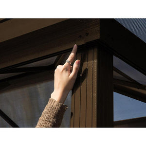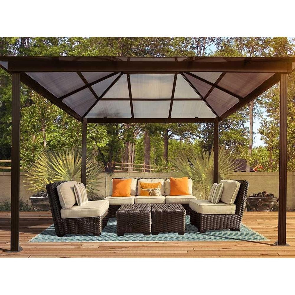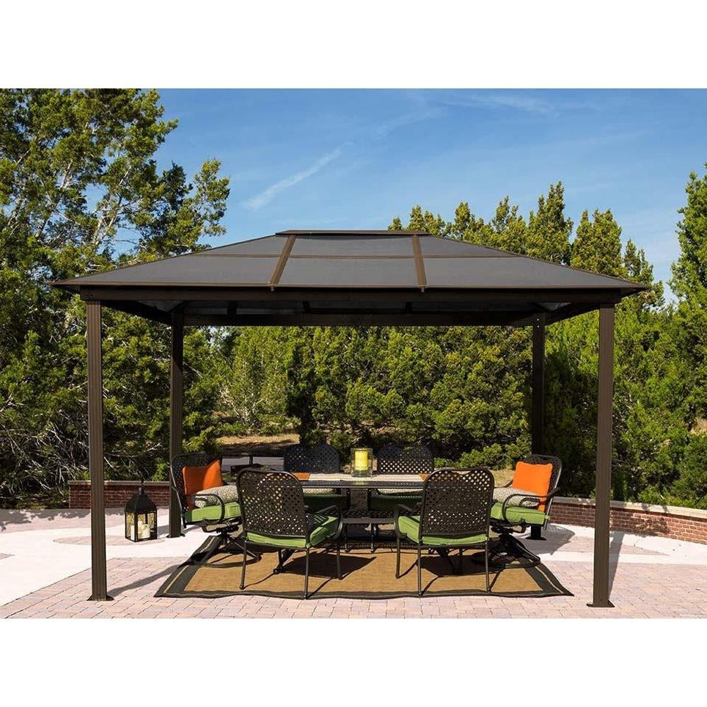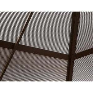 The Madrid hard-top gazebo by Paragon Outdoor provides the perfect amount of protection from the sun while being a stylish statement piece in your background. The roof panels are made of strong polycarbonate with a louvered texture that lowers the sunlight just the right amount and helps to reduce temperature inside the gazebo by 20% compared to non-louvered polycarbonate roofs. The powder coated, rust-free aluminum structure is not only handsome in appearance but simple to assemble, taking 2 to 3 people half a day to complete. It can be securely fixed to a variety of surfaces with the included hardware and requires next to no maintenance for years of enjoyment. Shipping is free and the generous warranty terms show the manufacturer’s confidence in their build quality. This is one decision you’ll be very glad you made. As the sun moves across the sky during the day, it almost seems as if the louvers are following the sun, keeping you comfortable under the protective covering of your Madrid gazebo. The Madrid's decorative triangular posts and frame structure are aluminum and powder coated in a brown/bronze shade to ensure years of worry-free use. The roof on the Madrid is UV resistant and offers up to 25% reduction of inside temperature compared to regular non-louvered polycarbonate gazebos. Although the Madrid is designed for easy assembly, consider this a project that will require approximately half a day with 2-3 people systematically following the step-by-step instructions in the assembly manual.
