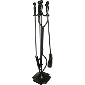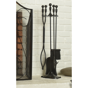 The ShelterLogic Black 5-piece cast iron toolset makes a perfect accent to any fireplace. The ergonomically designed handles are highly functional and allow for safe and easy tending of fires. The set includes: (1) Poker for adjusting wood and stoking fires; (2) Tongs to safely place kindling and reposition logs; (3) Shovel for scooping-up used firewood and ash; (4) Brush for sweeping debris; and (5) Heavy Duty Stand.