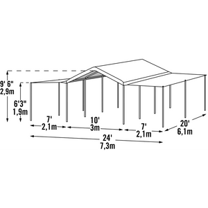 You receive: 1x 10x20 ft. / 3x6.1 m Steel Frame - White, 1x One-Piece Cover - White, 1x 4-Wall Enclosure Kit - White, 1x Extension Kit - White, Bungee Cords, 8x Foot Plates, Temporary Spike Anchors