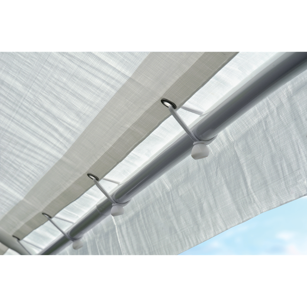 You receive: 1x One-Piece Cover -White, Bungee Cords, 6x Foot Plates, Temporary Spike Anchors