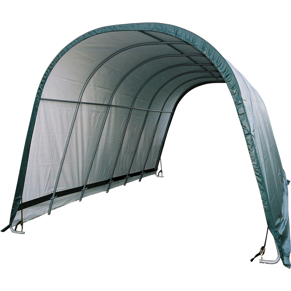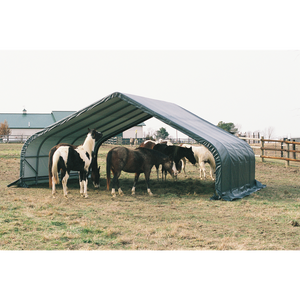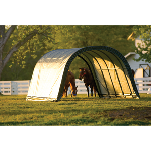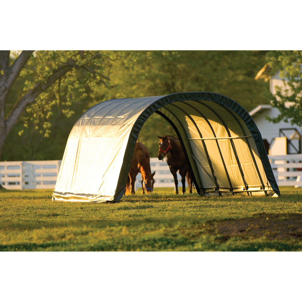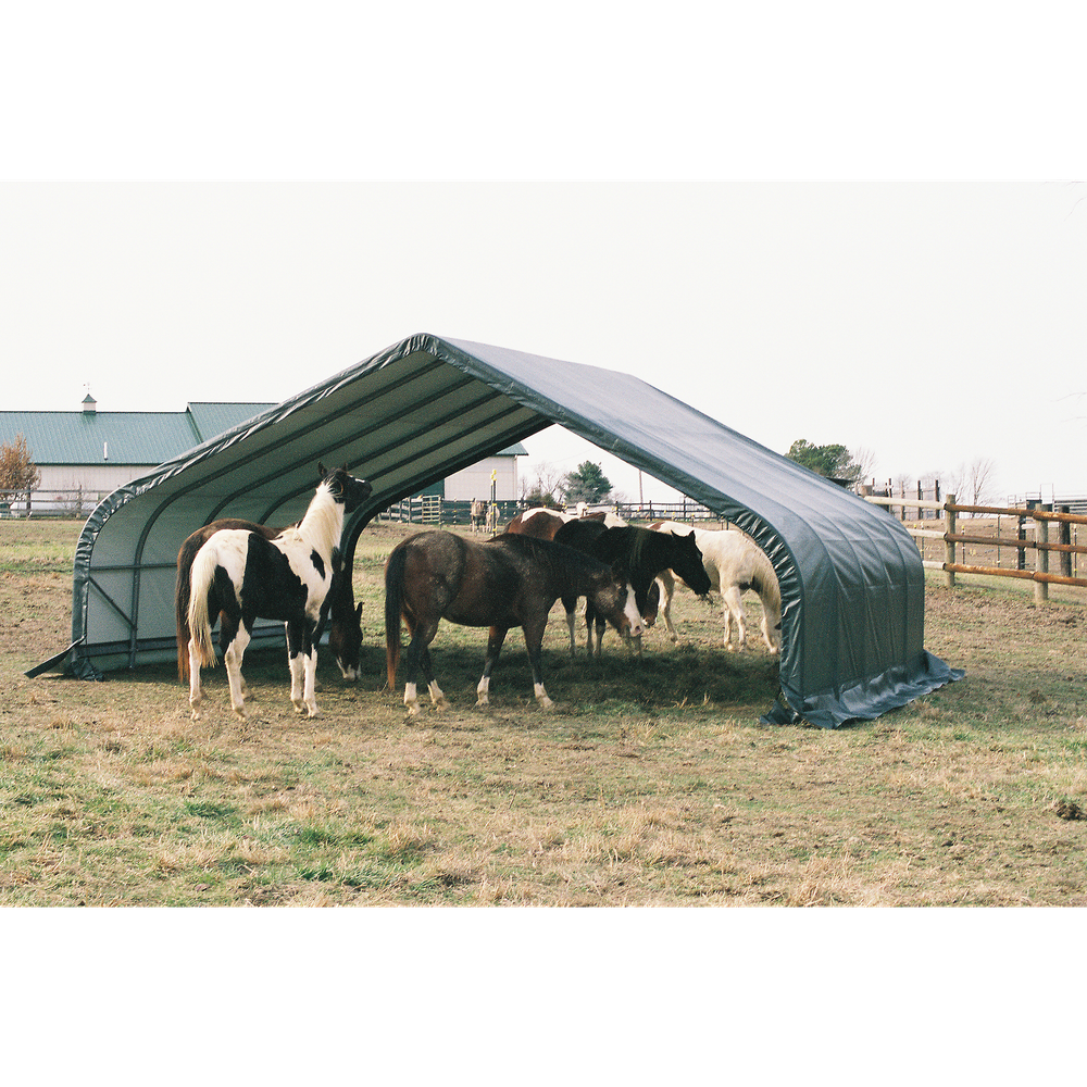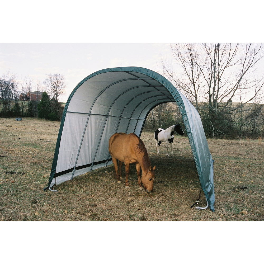 Ideal for sheltering horses, livestock, hay and field equipment, the ShelterLogic 12 x 20 x 8 ft. Equine Run-In-Shed has a spacious 240 sq. ft. coverage area that provides room for lots of your outdoor items. The high-grade 1-5/8 in. steel frame features a premium powder-coated finish that resists chipping, peeling, rust and corrosion. The durable 3-layer polyethylene cover is UV-treated inside and out to help withstand the elements.