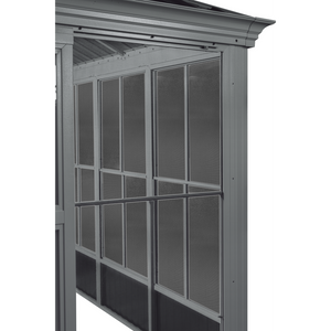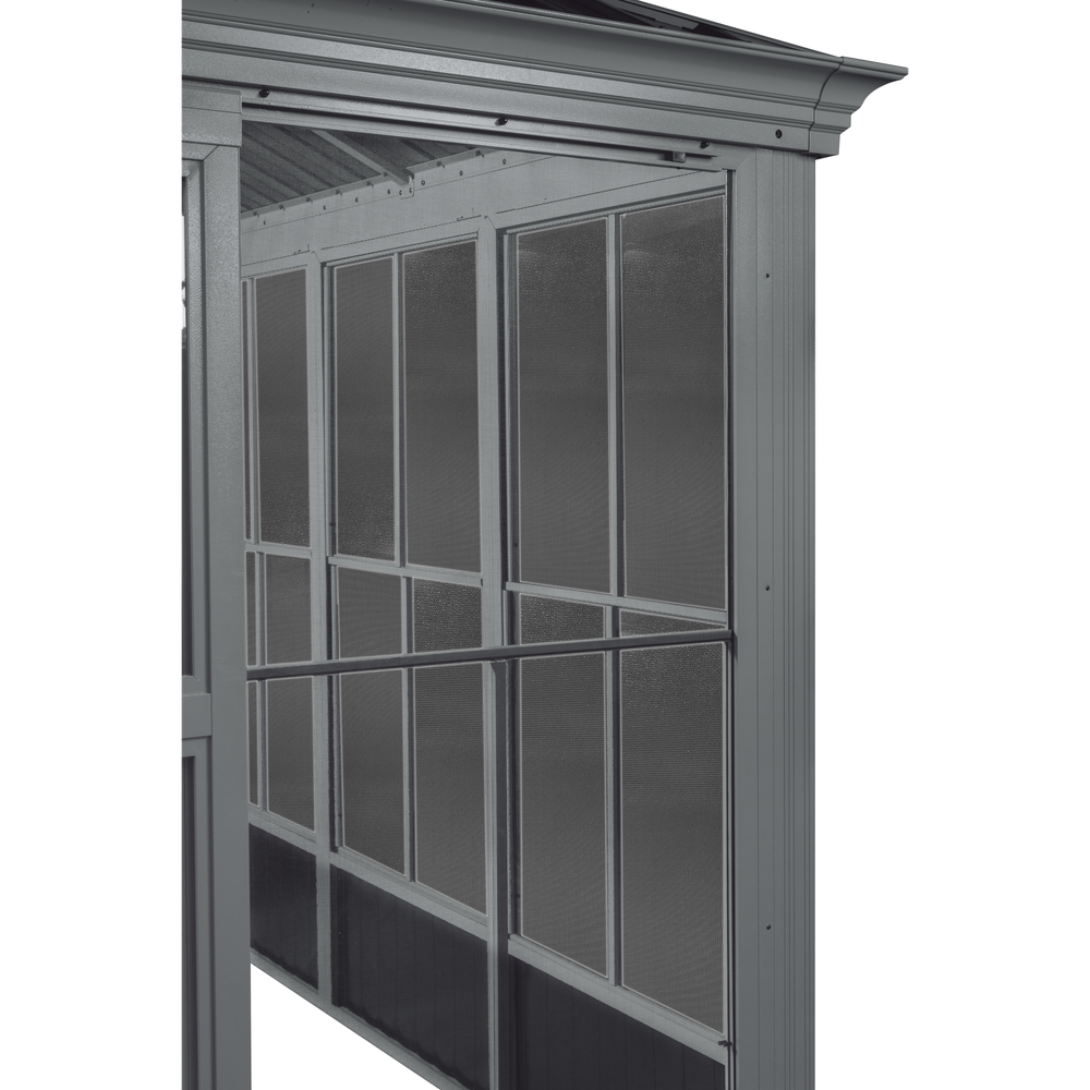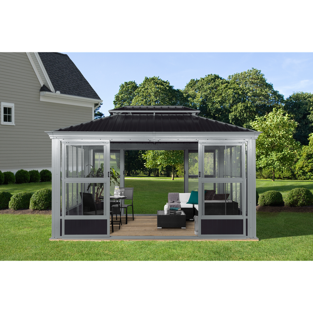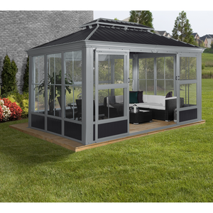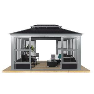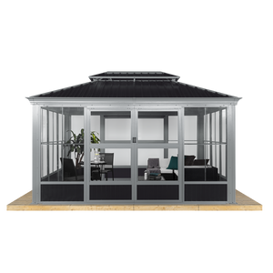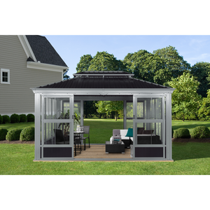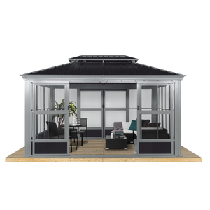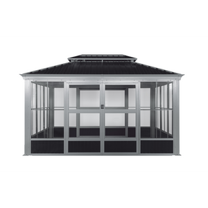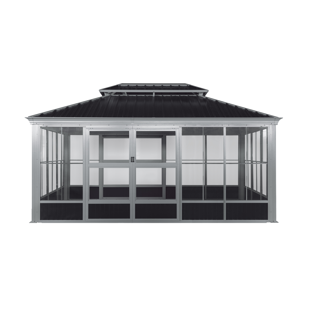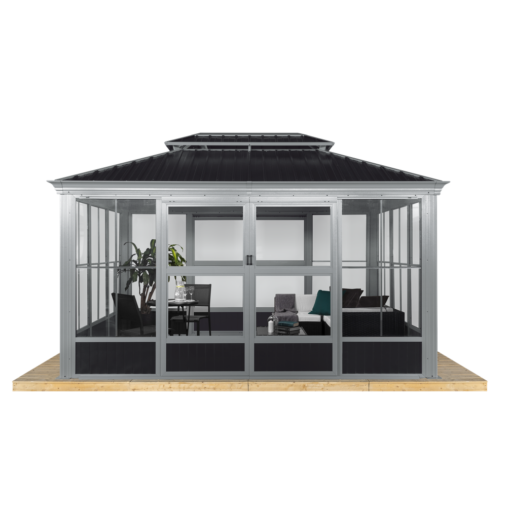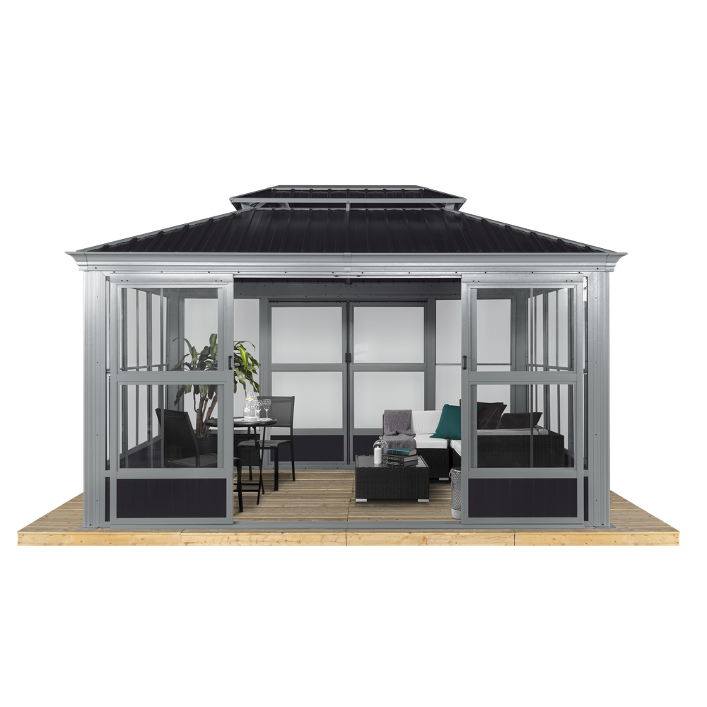 Create your private oasis, away from home, in your own backyard. With the 4 season Bolata solarium, you will be protected from the sun, rain, mosquitos and even snow, all while being surrounded by the beautiful outdoors. Its sturdy aluminum structure and galvanized steel roof will last for years to come. The Bolata features a double roof and 2 double sliding doors, allowing for additional air circulation. Each wall panel is equipped with netting and mica plastic windows. Enjoy as an outdoor extension to your living room or dining room in any weather!