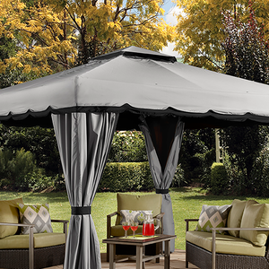 The Romano sun shelter features a polyester roof designed to protect you on long days in the summer sun. It is engineered to ensure simple set up while its lightweight, powder-coated aluminum frame provides strength and stability. The Romano is equipped with a stylish modern frame, polyester fabric top, along with tasteful polyester curtains and nylon mosquito net curtains allowing you and your family proper ventilation and protection all summer long.