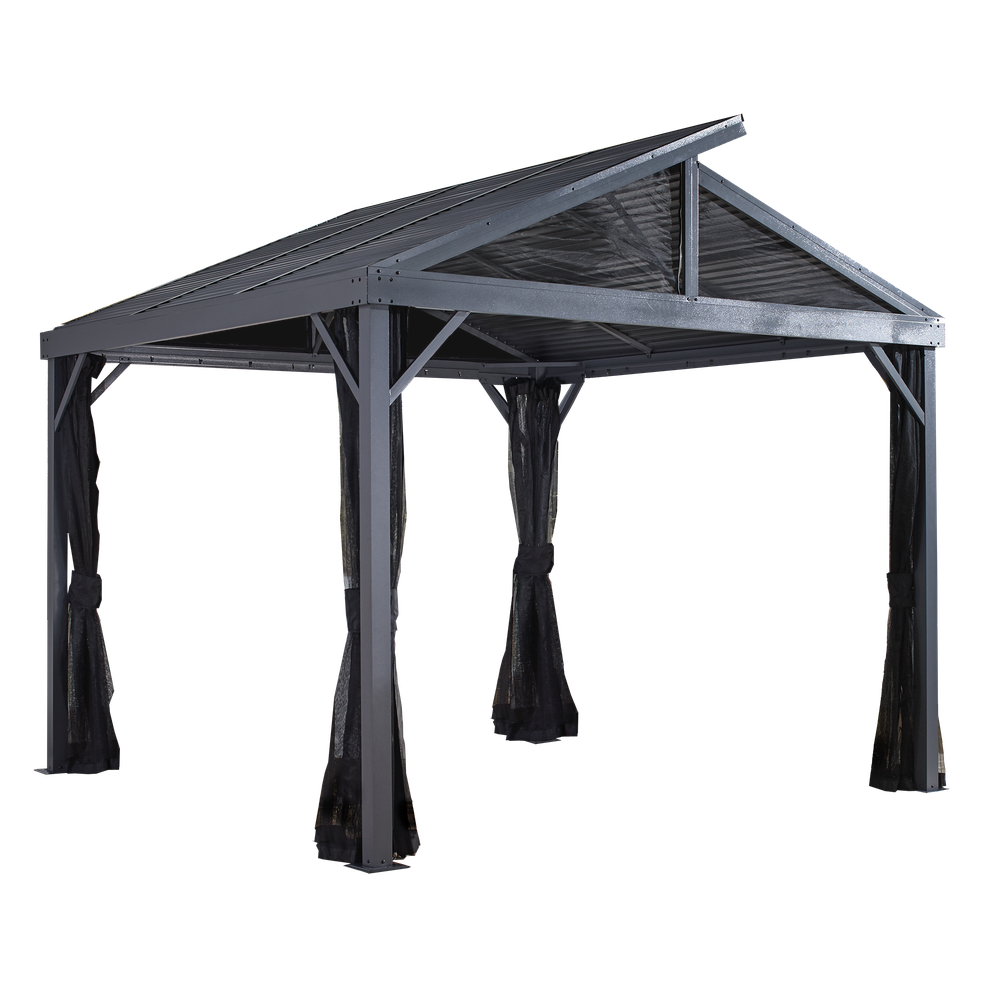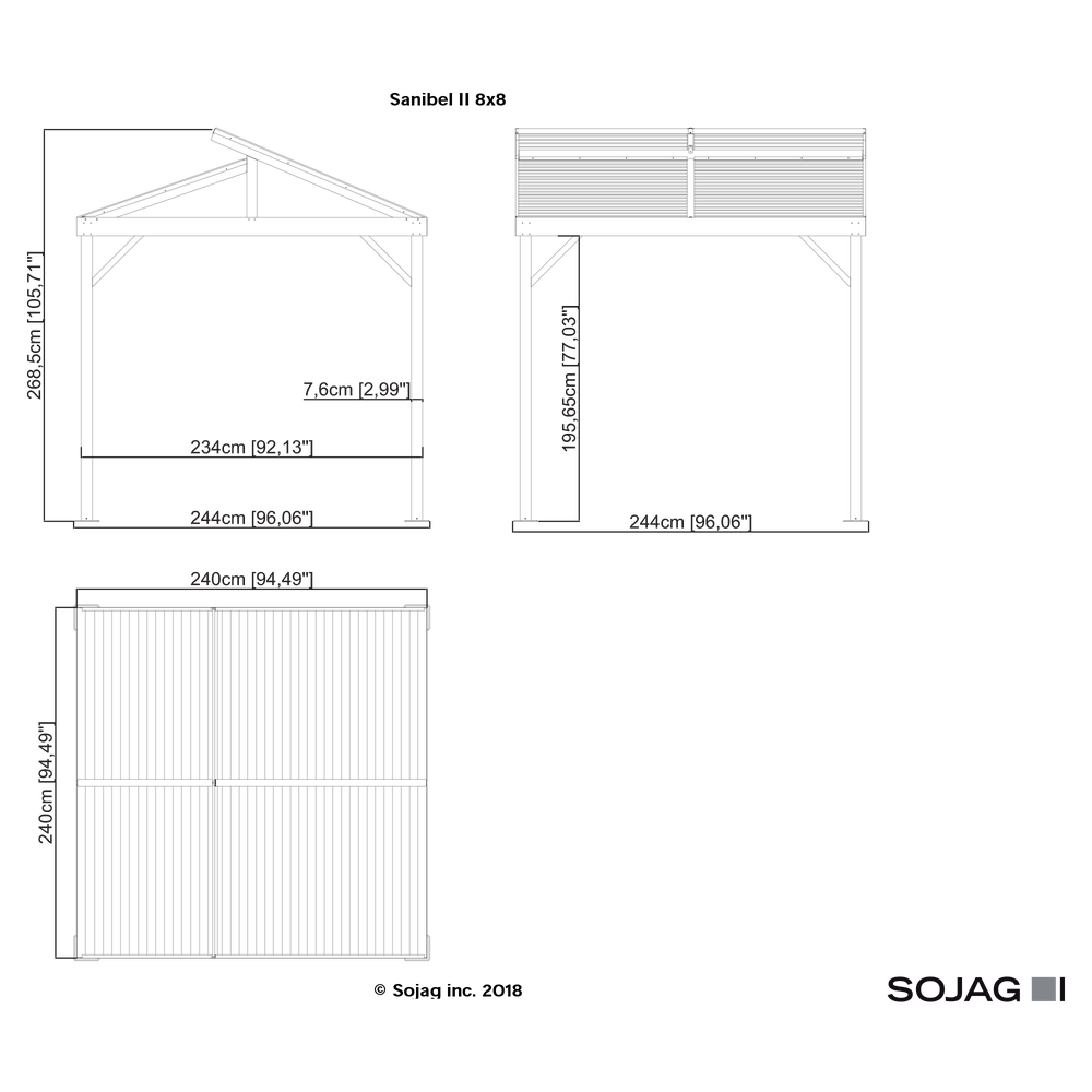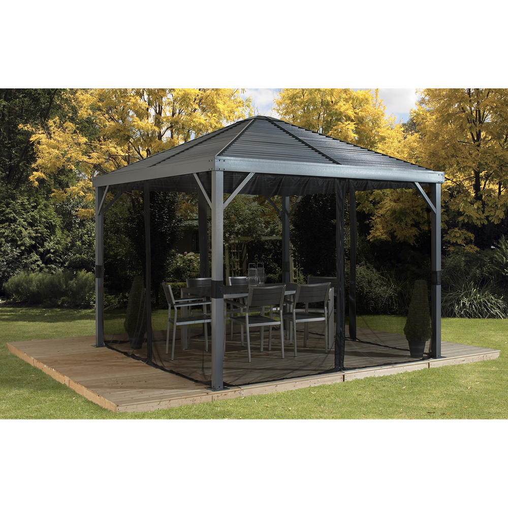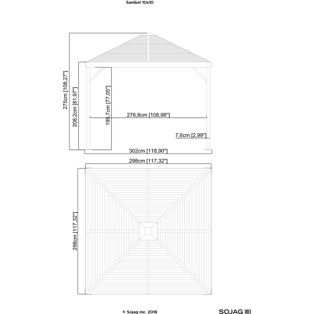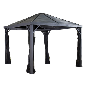 Modernize your outdoor relaxation area with the all-new Sanibel sun shelter generation from Sojag. Having clean lines, without fancy frills, it is as practical as it is attractive. Being offered with three different roof versions, it will satisfy the designer in you. Just search for Sanibel and Sanibel II to compare and make your choice. Regardless of the version, the Sanibel will provide you the desired shade using galvanized steel roof and will serve as an outdoor dining room when you receive family and friends. Why deprive yourself?
