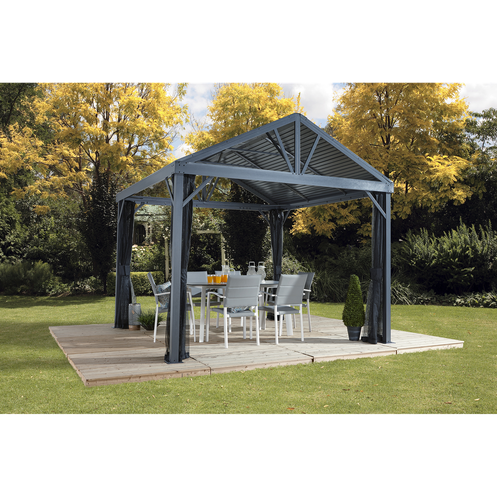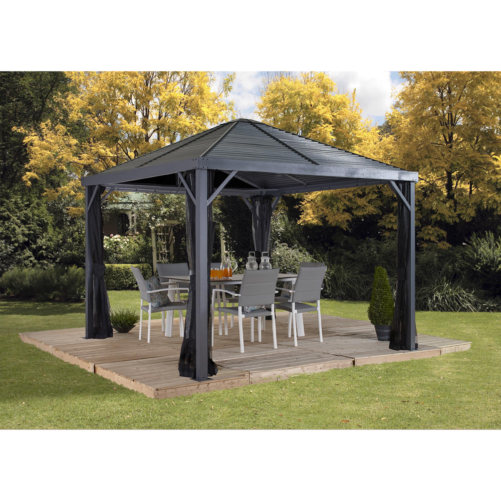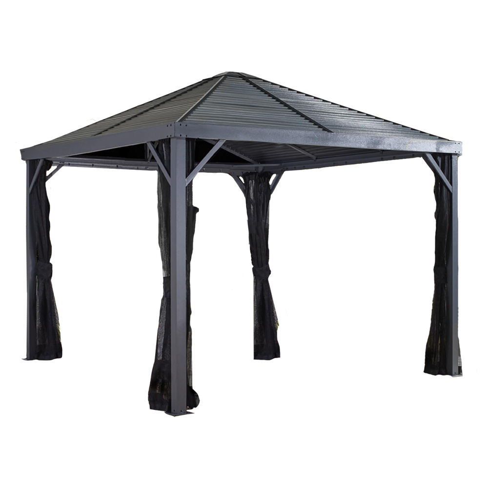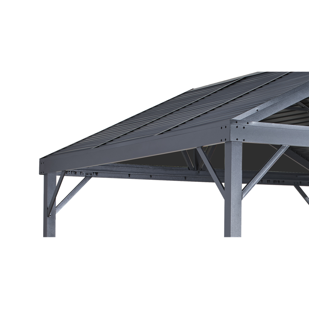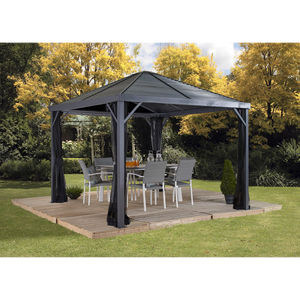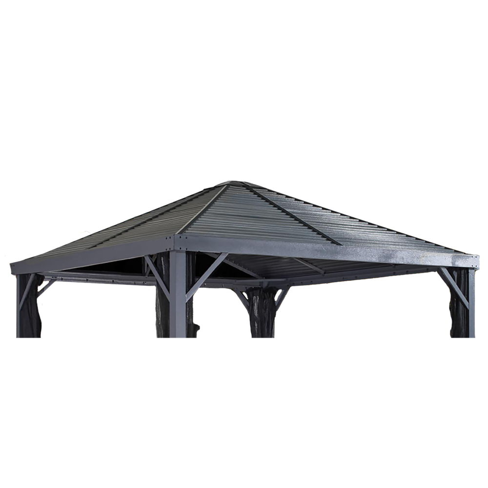 Modernize your outdoor relaxation area with the all-new Sanibel sun shelter generation from Sojag. Having clean lines, without fancy frills, it is as practical as it is attractive. Being offered with three different roof versions, it will satisfy the designer in you. Just search for Sanibel and Sanibel II to compare and make your choice. Regardless of the version, the Sanibel will provide you the desired shade using galvanized steel roof and will serve as an outdoor dining room when you receive family and friends. Why deprive yourself?
