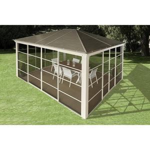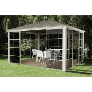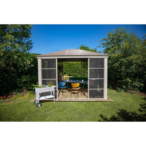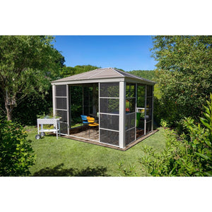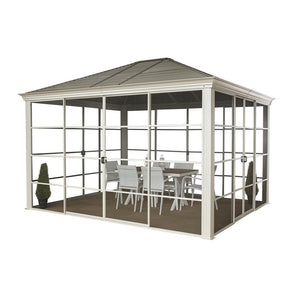 Create the perfect outdoor space with the Striano screen house. This beautiful screen house boasts double sliding doors on all 4 sides of the aluminum structure, along with a galvanized steel roof. It features wall to wall screens, which allow you and loved ones to enjoy eating or relaxing outside without pesky bugs.