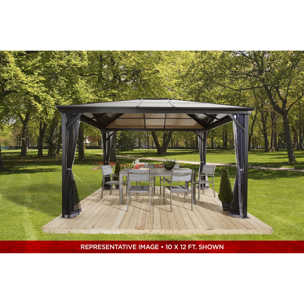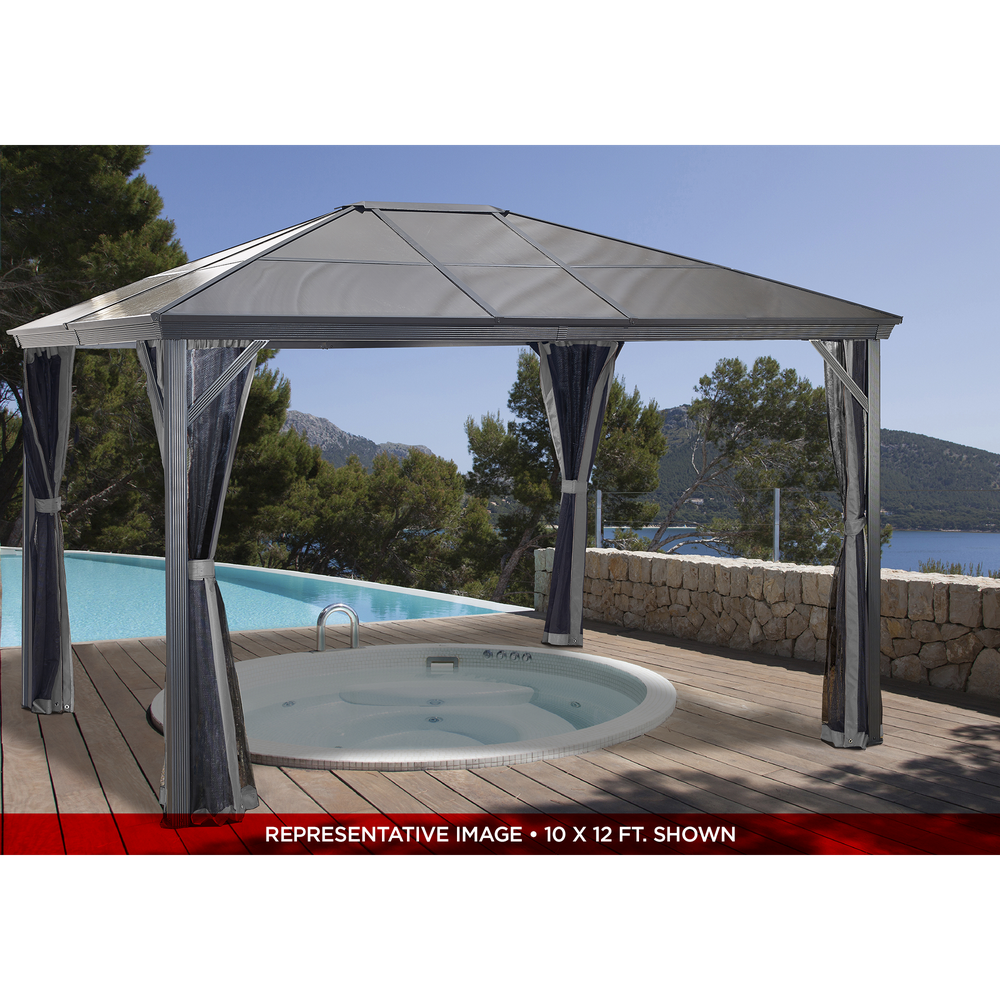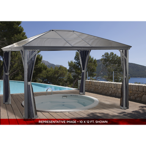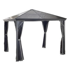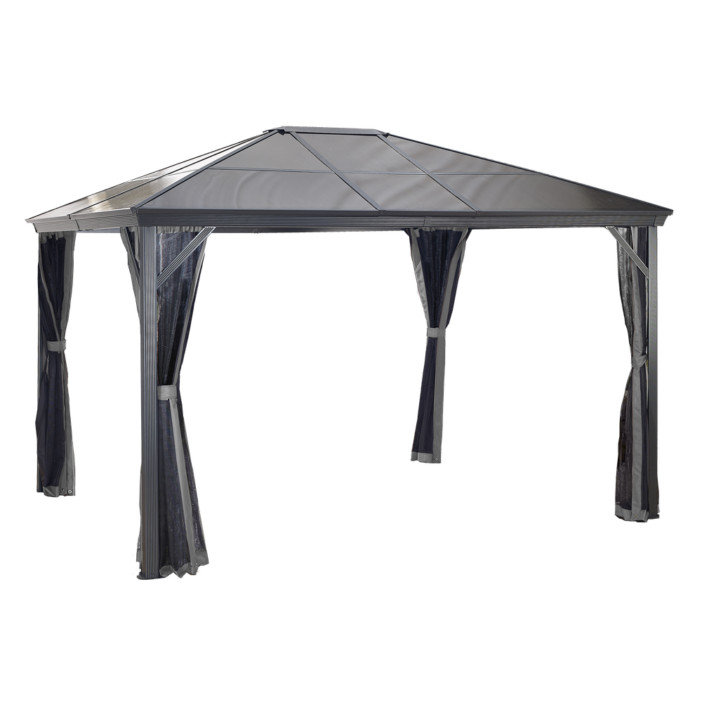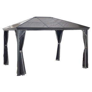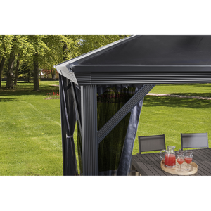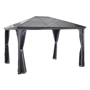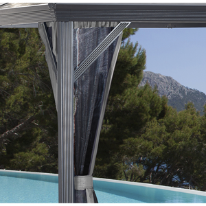 Improve your outdoor setting with a sun shelter that stays up all year long. The Verona is perfect for those who enjoy a nicely shaded environment on a hot Summer day or the feeling of a warm breeze on a summer night. This sun shelter's modern design features high quality aluminum and includes a nylon mosquito net to keep your space free from pesky bugs. The roof is made of weather-resistant corrugated polycarbonate sheets, making this sun shelter perfect for all seasons.